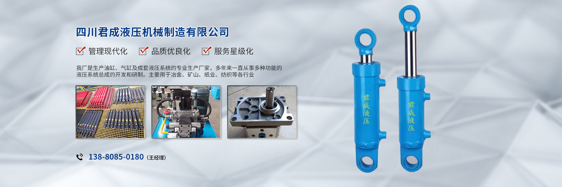 公司主導(dǎo)產(chǎn)品:液壓油缸HSG1全系列,YHG1型冶金設(shè)備缸,以及GHF1系列高壓液壓缸、多級(jí)缸等。扣壓式全系列液壓膠管以及特殊要求的液壓膠管總成。公司銷售項(xiàng)目還包括各種管接頭、多路閥、液壓鎖、液壓系統(tǒng)、頂磚機(jī)、全液壓式垃圾庫(kù)等,承接各類大、中型成套液壓系統(tǒng)的設(shè)計(jì)制造、安裝和調(diào)試服務(wù)。
